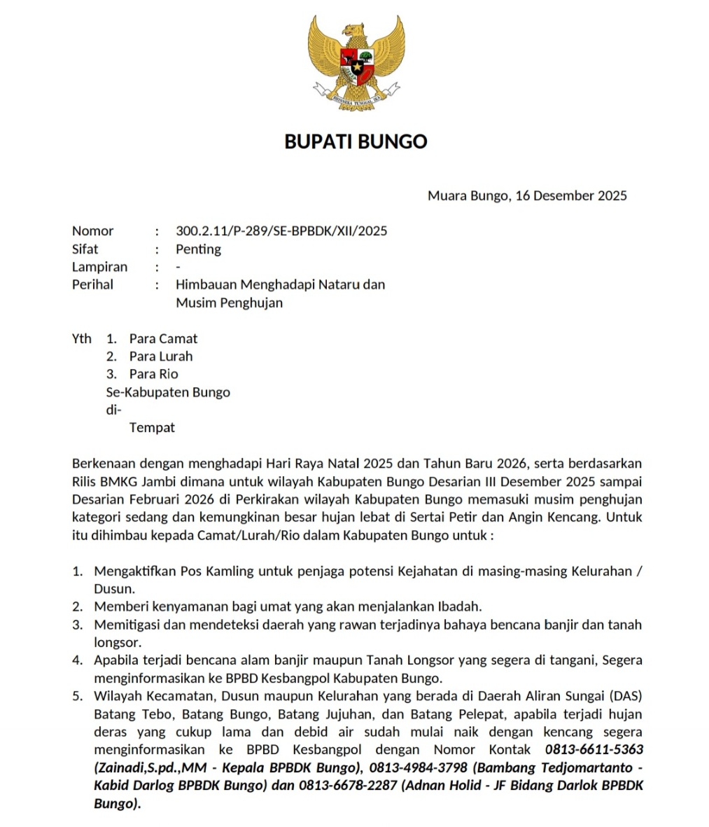Bupati Bungo H. Dedy Putra, SH., M.Kn. secara resmi menerbitkan Surat Imbauan Nomor 300.2.11/P-289/SE-BPBDK/XII/2025 tertanggal 16 Desember 2025 yang ditujukan kepada seluruh camat, lurah, dan rio di wilayah Kabupaten Bungo.